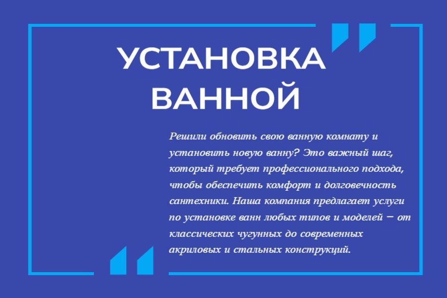 - Безопасность и чистота. При установке ванны мы уделяем особое внимание безопасности и чистоте рабочего пространства. После завершения всех работ мы обязательно убираем за собой, чтобы вы могли сразу наслаждаться новой ванной без дополнительных хлопот.
