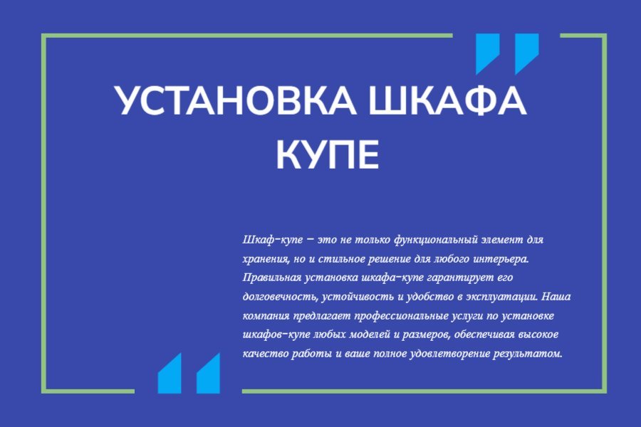 Шкаф-купе – это не только функциональный элемент для хранения, но и стильное решение для любого интерьера. Правильная установка шкафа-купе гарантирует его долговечность, устойчивость и удобство в эксплуатации. Наша компания предлагает профессиональные услуги по установке шкафов-купе любых моделей и размеров, обеспечивая высокое качество работы и ваше полное удовлетворение результатом.